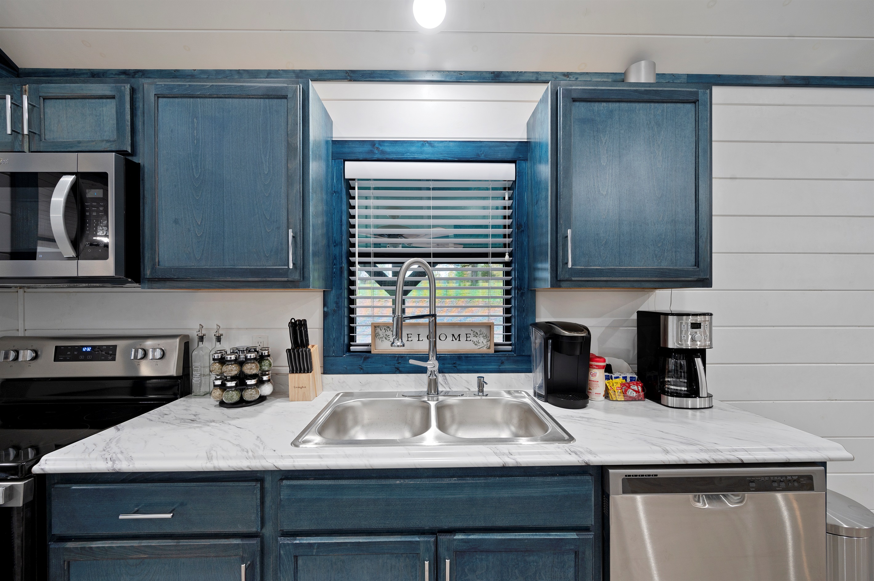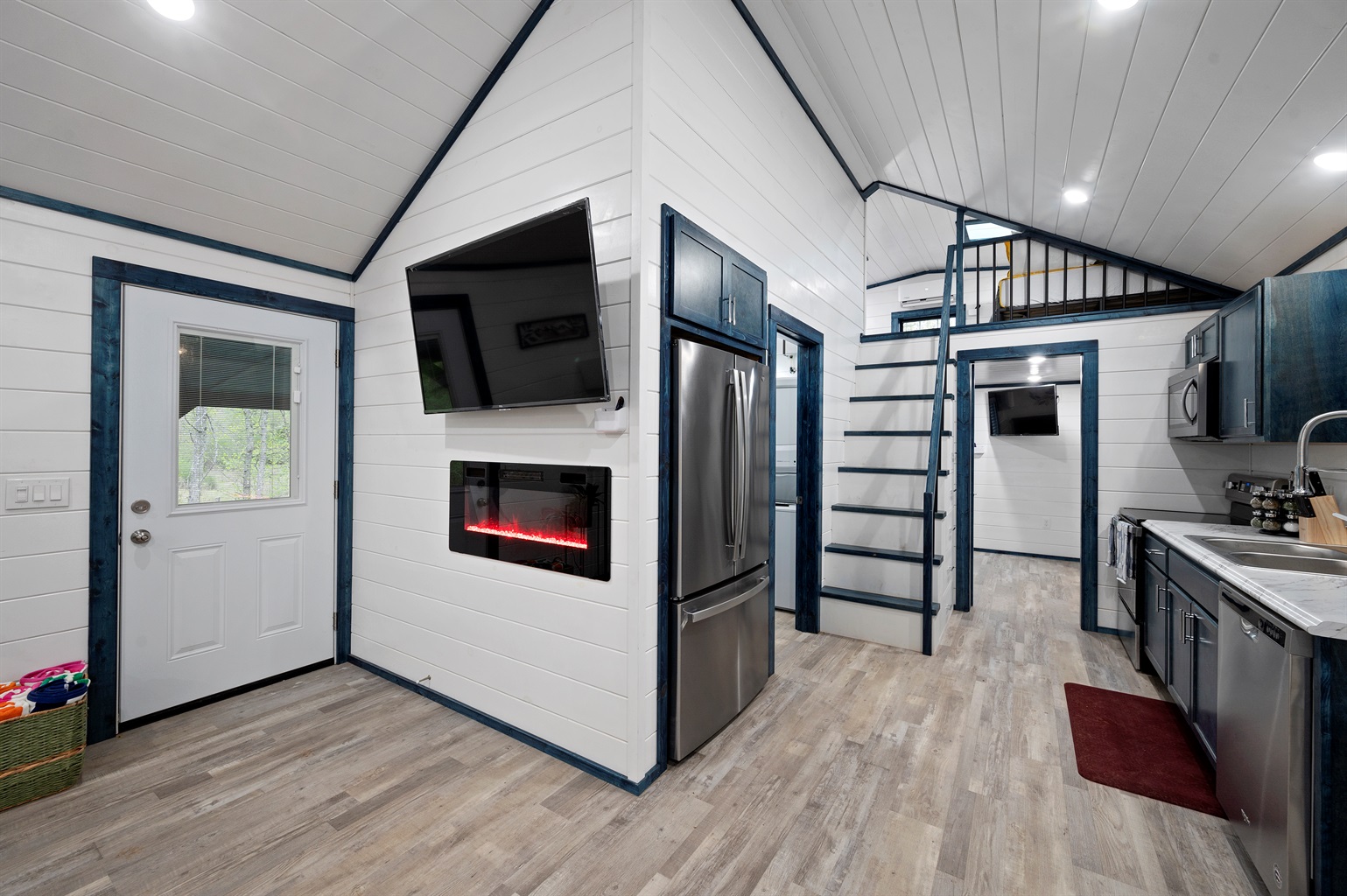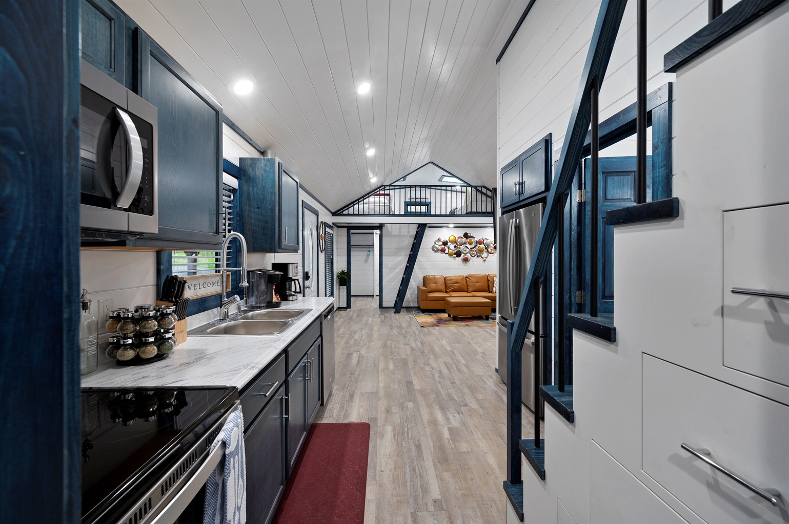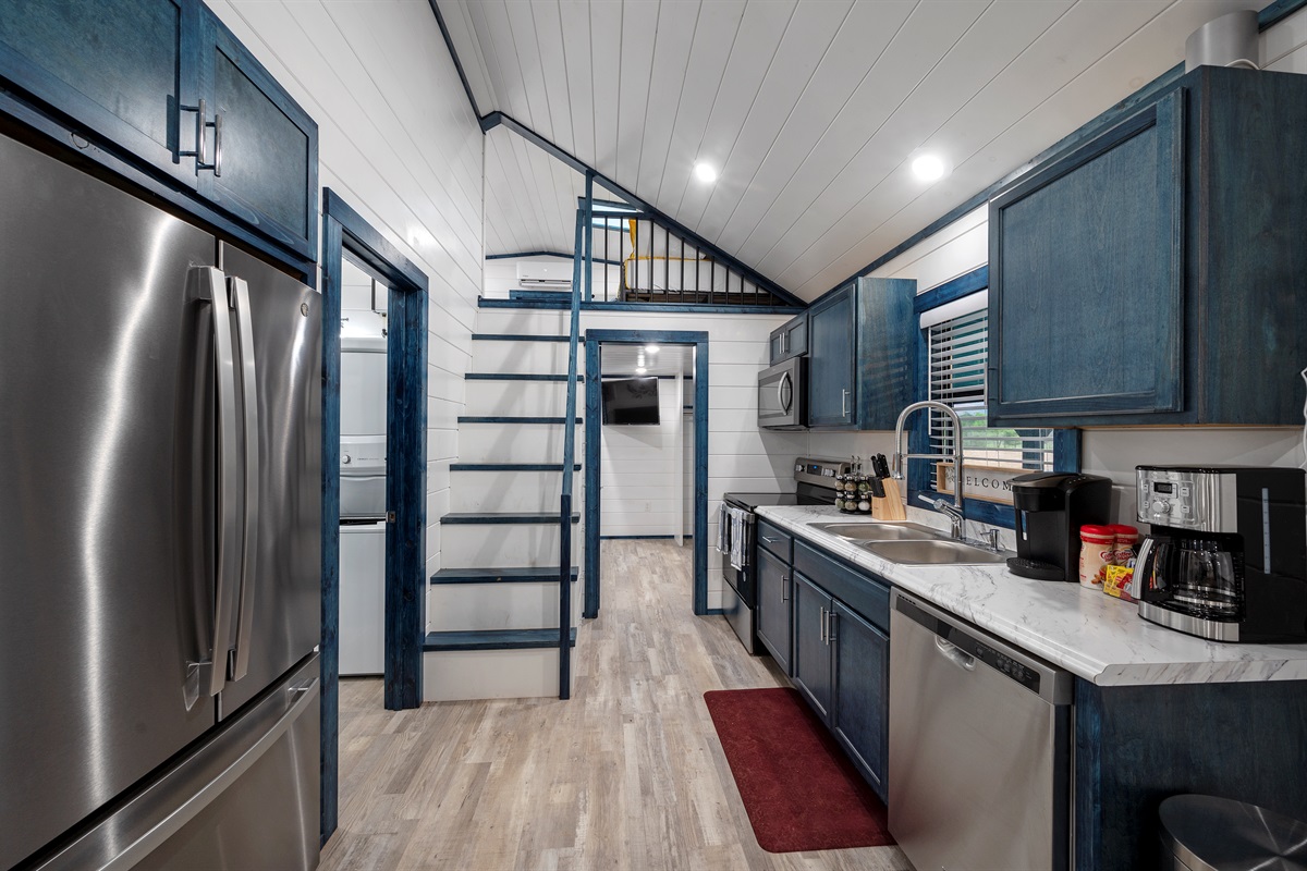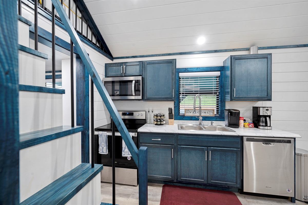 Full kitchen with stove, oven, refrigerator, dishwasher, and microwave